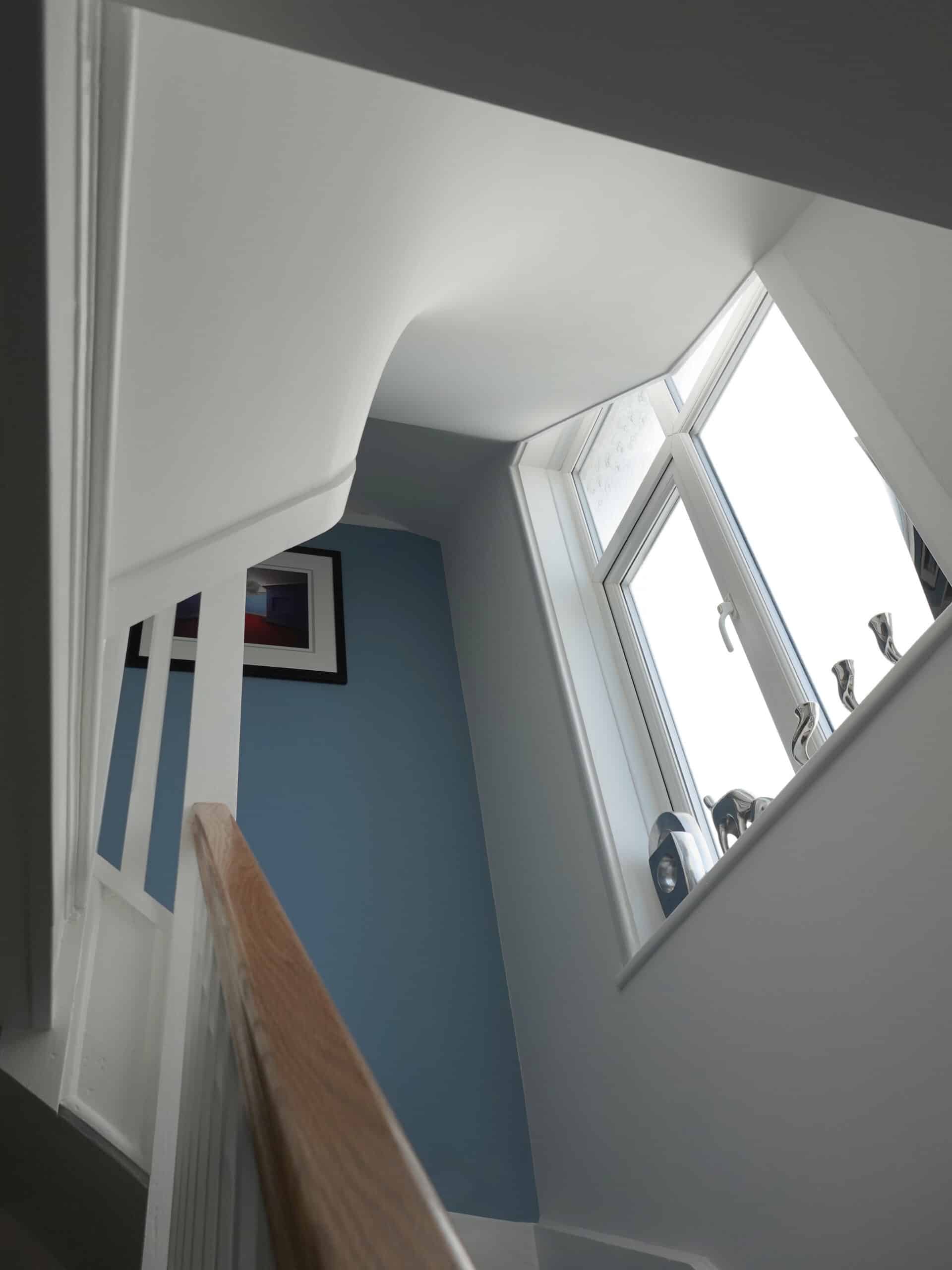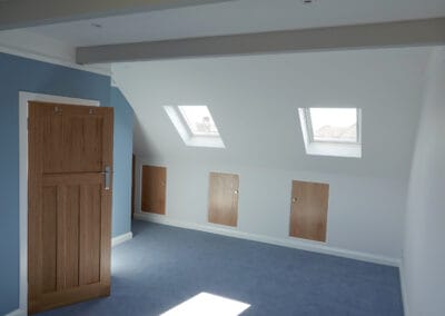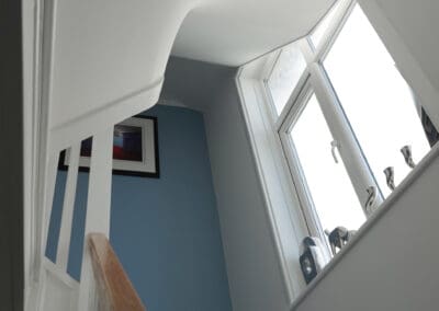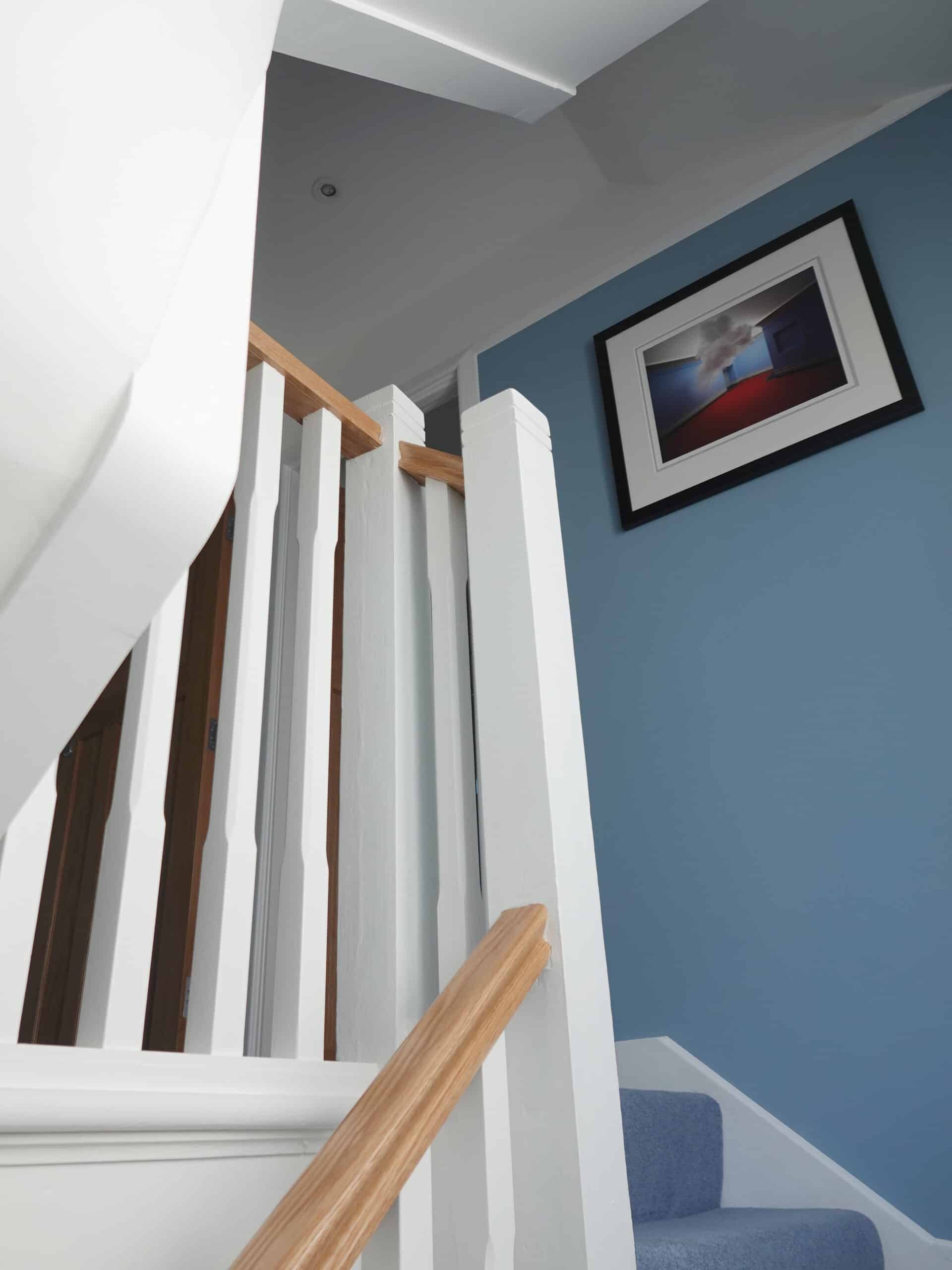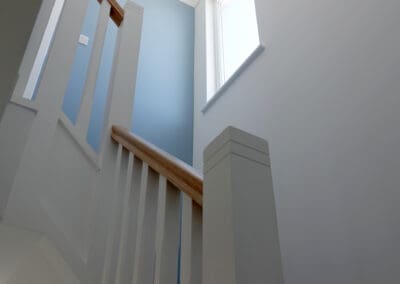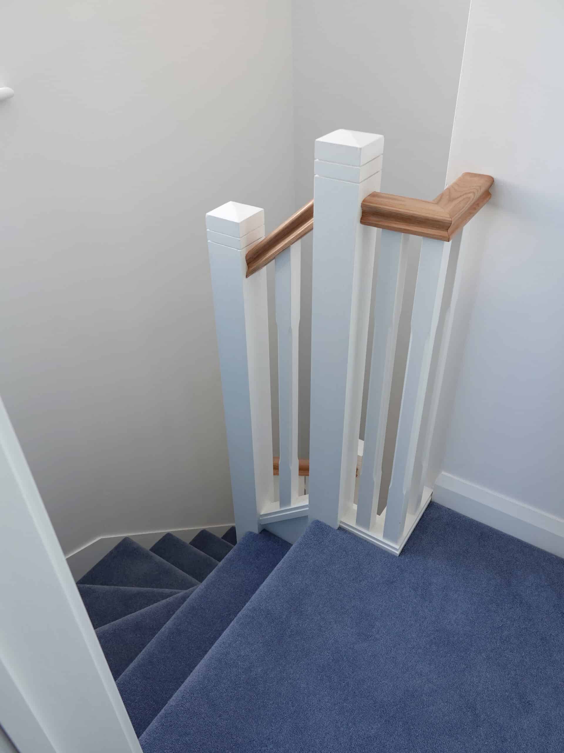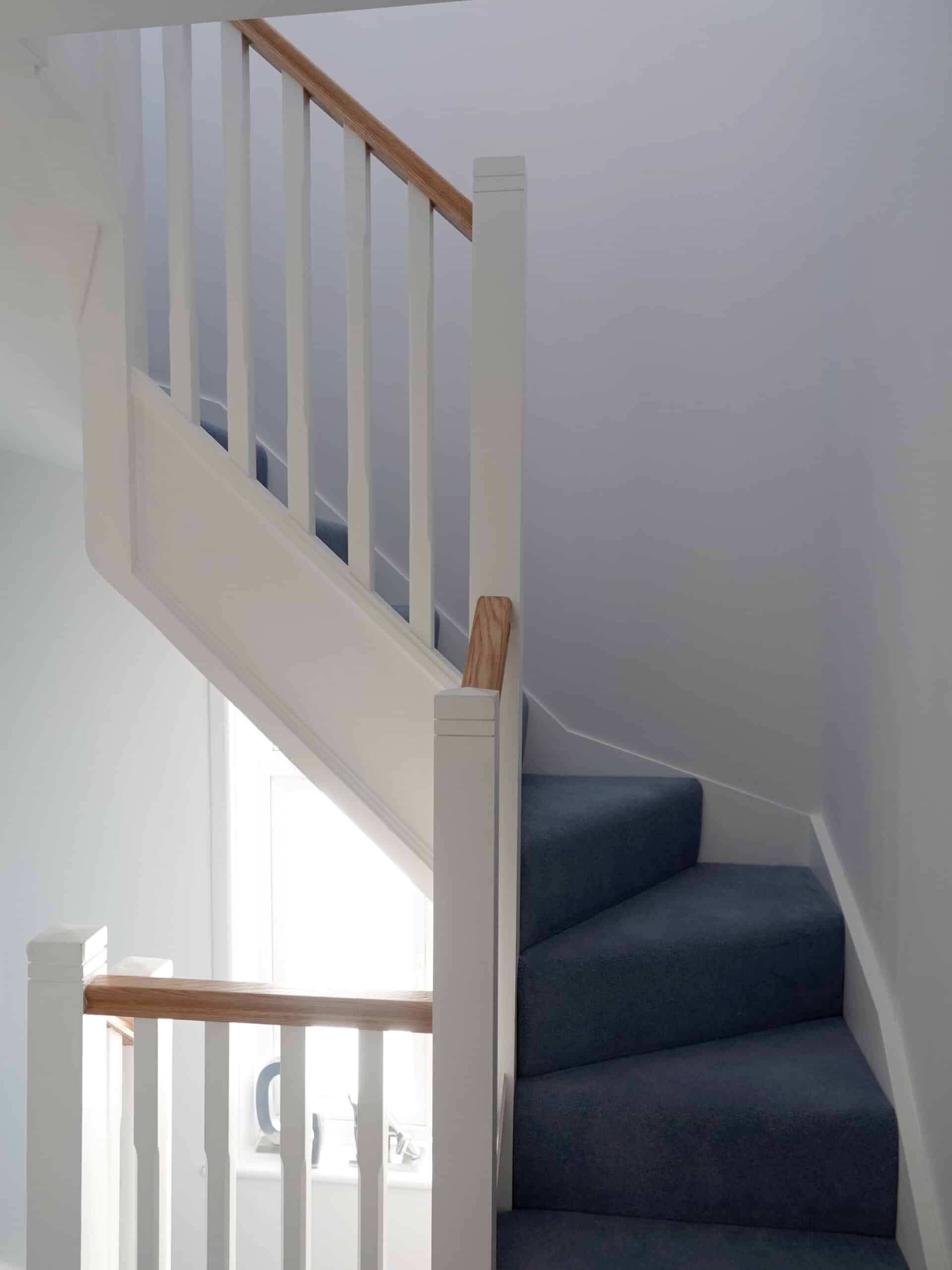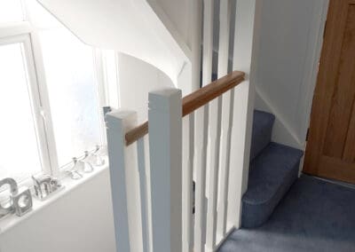 Loft conversion in Stoneleigh with an ensuite bathroom. With an almost nautical colour scheme and winding staircase this loft conversion is a great showcase.